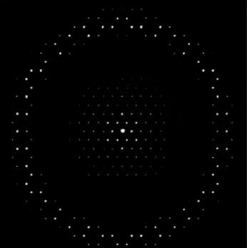 单晶花样是一个零层二维倒易截面,其倒易点规则排列,具有明显对称性,且处于二维网格的格点上。