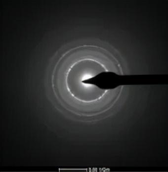 多晶面的衍射花样为各衍射圆锥与垂直入射束方向的荧光屏或者照相底片的相交线,为一系列同心圆环。每一族衍射晶面对应的倒易点分布集合而成一半径为1/d的倒易球面,与Ewald球的相贯线为圆环,因此样品各晶粒{hkl}晶面族晶面的衍射线轨迹形成以入射电子束为轴,2θ为半锥角的衍射圆锥,不同晶面族衍射圆锥2θ不同,但各衍射圆锥共顶、共轴。