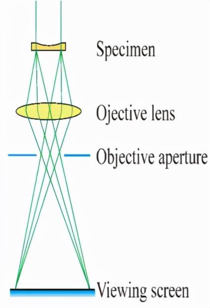 透射电镜和光学显微镜的各透镜及光路图基本一致,都是光源经过聚光镜会聚之后照到样品,光束透过样品后进入物镜,由物镜会聚成像,之后物镜所成的一次放大像在光镜中再由物镜二次放大后进入观察者的眼睛,而在电镜中则是由中间镜和投影镜再进行两次接力放大后最终在荧光屏上形成投影供观察者观察。电镜物镜成像光路图也和光学凸透镜放大光路图一致。