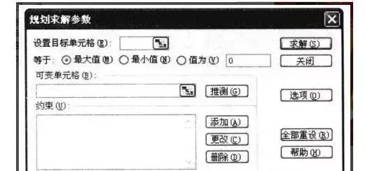 规划求解(下图),简单地说就是“线性规划法程序”,包括线性规划法,非线性规划法和整数规划法.打开“线性规划法’,读者可能会觉得难以操作。“规划求解”是在多种约束条件(公式化)下,为了使目标变量最大(最小)而求解未知数(也叫参数)的工具,使用范围非常广泛。