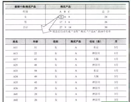 Excel可以将表格中的数据转换成“数据透视表”。数据透视表又叫“交叉表”。交叉表是把数据“分层”的表。数据挖掘时“分层”也是非常重要的一环。例如,分析销售数据时,从性別、年龄、星期、天气等不同的角度进行分析,通常能够得到非常有趣的结果。但是,每次改变角度时都需要修改表格数据,非常麻烦。使用菜单栏的“数据”→“数据透视表和数据透视图”,就能方便地制作分层表。点击鼠标,可以方便地切换分析的角度。另外,双击交叉表内单元格中的数字,还可以显示该数字详细的数据(下表)。