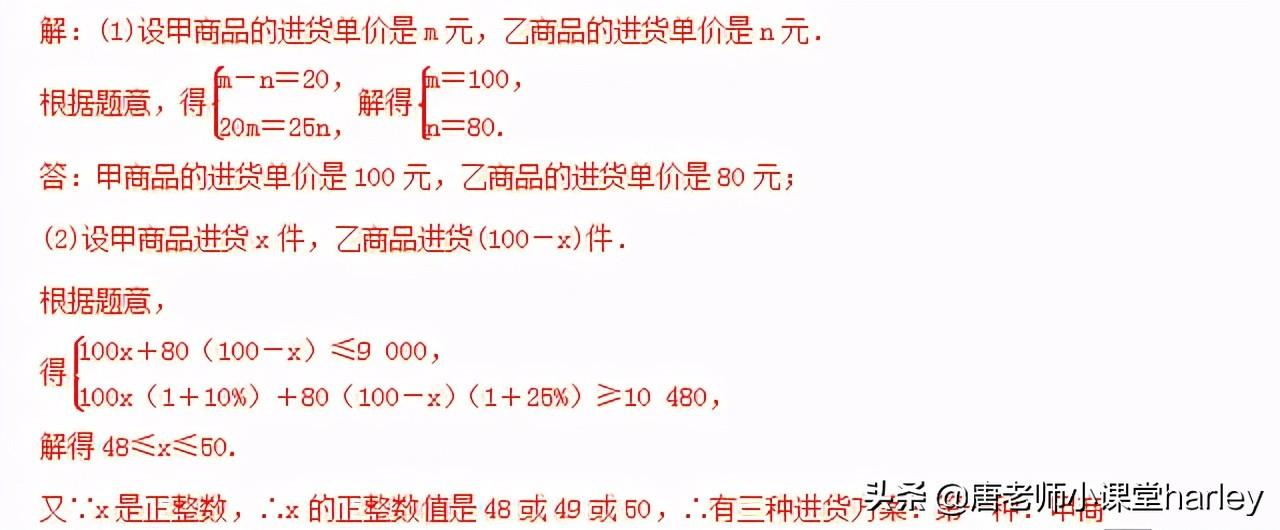 (2)若甲、乙两种商品共进货100件,要求两种商品的进货总价不高于9 000元,同时甲商品按进价提高10%后的价格销售,乙商品按进价提高25%后的价格销售,两种商品全部售完后的销售总额不低于10 480元,问有几种进货方案?