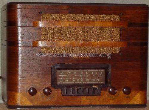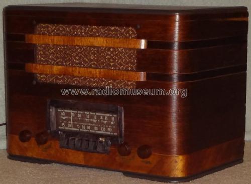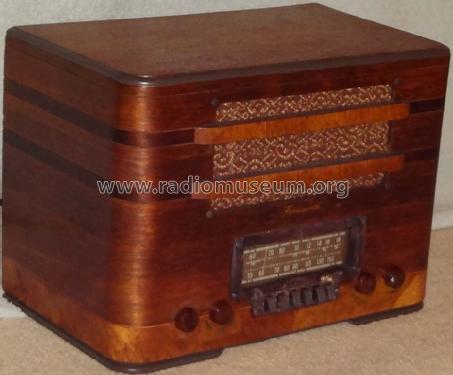 该产品似乎是Farnsworth Model AT-50。 除了覆盖广播频段外,它可以接收6-17 MHz的短波频段,可以从欧洲获取战争新闻。 尽管广告说的是,调整范围并不是连续的,并且没有涵盖较低的短波段或警用波段。 它是具有一个RF级的超级电路,并且具有6SK7,6A8GT,6SK7,6SQ7,6H6,25L6GT和25Z6GT的电子管阵容。 它具有六个广播频段预设的按钮调谐功能。