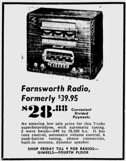 1941年8月28日,《密尔沃基报》刊载了这款以28.8美元的价格从Gimbels百货商店购买了这款Farnsworth 7电子管收音机的广告。