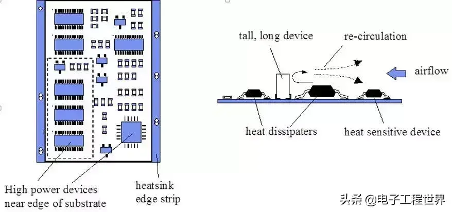 e、设备内印制板的散热主要依靠空气流动,所以在设计时要研究空气流动路径,合理配置器件或印制电路板。空气流动时总是趋向于阻力小的地方流动,所以在印制电路板上配置器件时,要避免在某个区域留有较大的空域。整机中多块印制电路板的配置也应注意同样的问题。