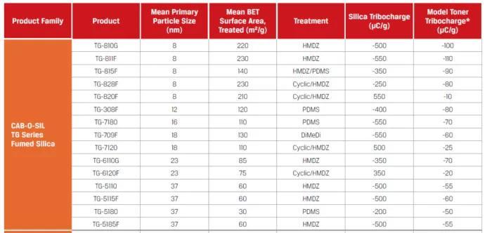 总的来说,在墨粉行业中,气相法二氧化硅的粒径、表面处理工艺,表面带电强弱都对墨粉的打印质量起着至关重要的作用,卡博特墨粉二氧化硅的主要型号有:TG-810G,TG-811G,TG-815F,TG-828F,TG-820F,TG-308F,TG-7180,TG-709F,TG-7120,TG-6110G,TG-6120F,TG-5110,TG-5115F,TG-5180,TG-5185F等。