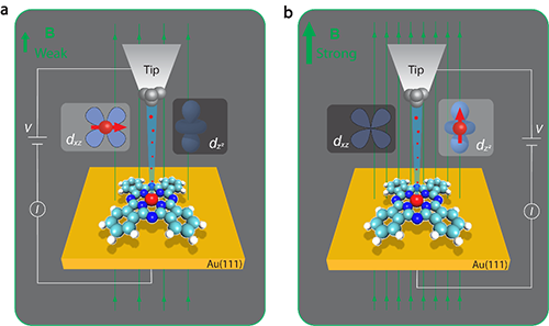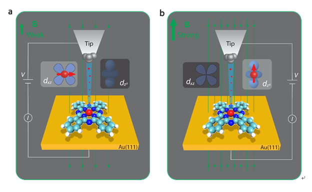 图1. 磁场对金单晶表面单个酞菁铁分子的电子传输路径调控示意图。