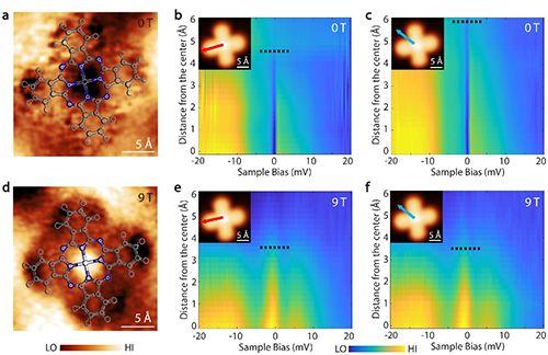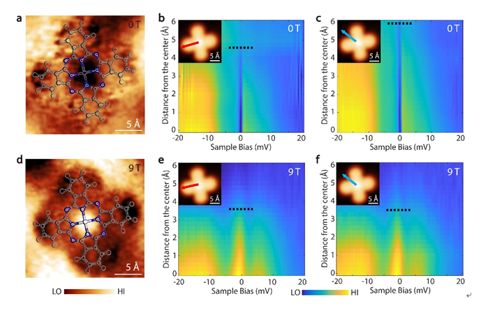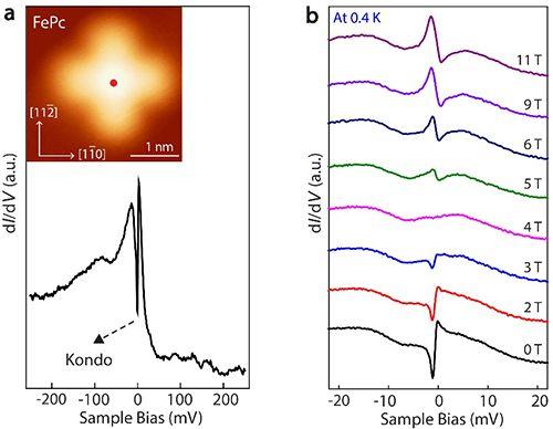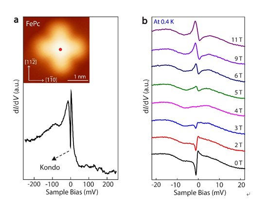 图2. 单个酞菁铁分子Kondo共振信号随磁场的变化。
