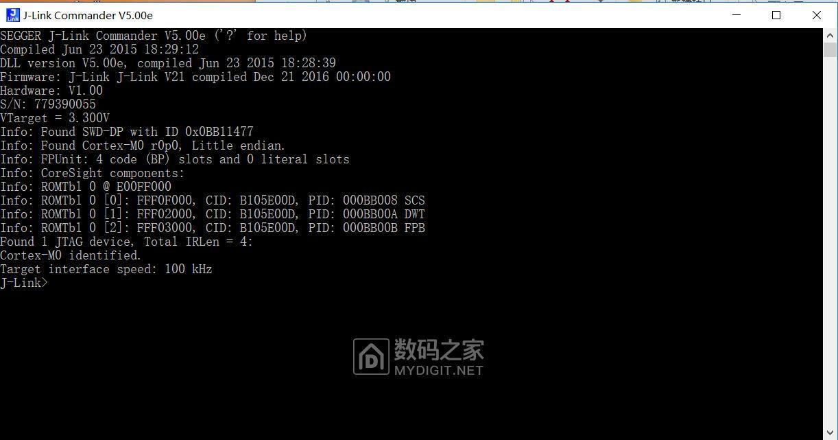 打开JLINK 命令行软件,可以看到找到了CORTEX M3内核的设备,说明连接线没错
