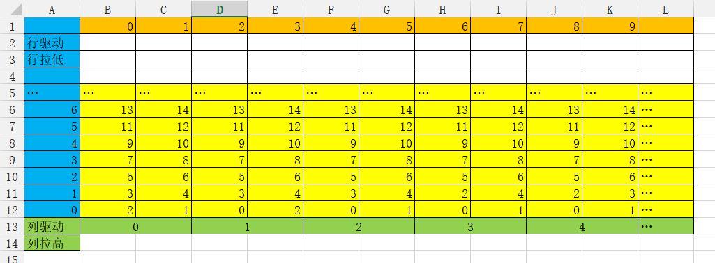 引脚的驱动方式是,每两列用同一个列选拉高,每一行用两个行选拉低