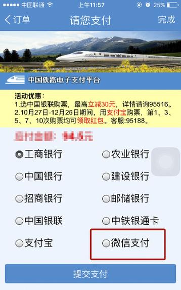 2017年11月23日起,微信支付全面接入铁路12306购票平台,用户在12306官网或官方APP上可使用微信支付购买车票。