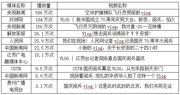 以“阅兵vlog”为关键词在微博、百度、Bilibili等大型媒体平台进行搜索,剔除无效样本和重复样本,一共获得24条主流媒体的阅兵vlog样本。本文把播放量排名前十的阅兵vlog作为主要研究样本,发现2019年主流媒体热门阅兵vlog具有如表1的传播特征。