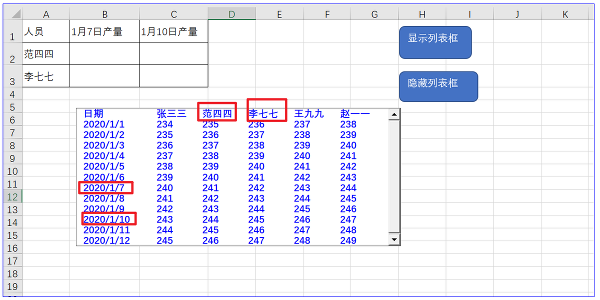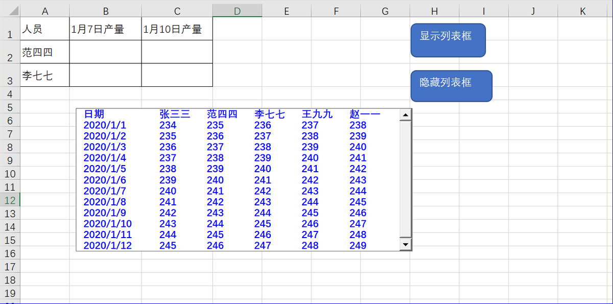 在实际的录入工作中,这个时候如果能弹出一个对话框,显示两个人在这相应两天的产量,那将是我们非常需要的,那么这个功能就要靠列表框来实现了。