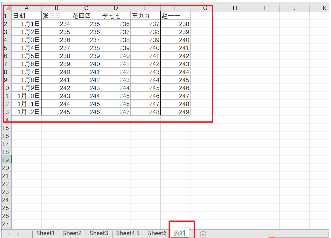 1) 首先,要确定一下所需要的数据来源,我们在对工作表的分析中得知数据来源于一个名为“资料”的工作表。如下: