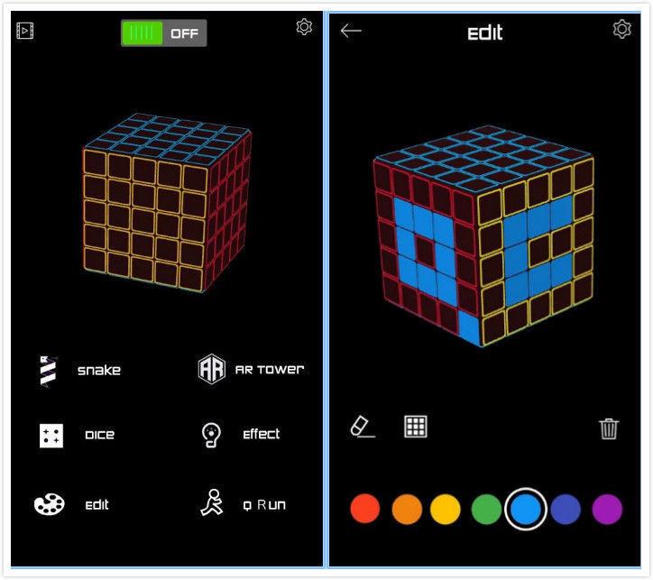 在手机上下载 app 后,你可以启动 QCoo,选择贪吃蛇游戏,当 LED 灯光亮起,你就能看到这个「魔方」上面显示出经典的贪吃蛇点阵,通过把手中的魔方转来转去,你可以控制他沿着立方体的六个面不停吃小红点,而你的「贪吃蛇」会越来越长,游戏也会越来越困难,玩起来就是一个立体「贪吃蛇」游戏!
