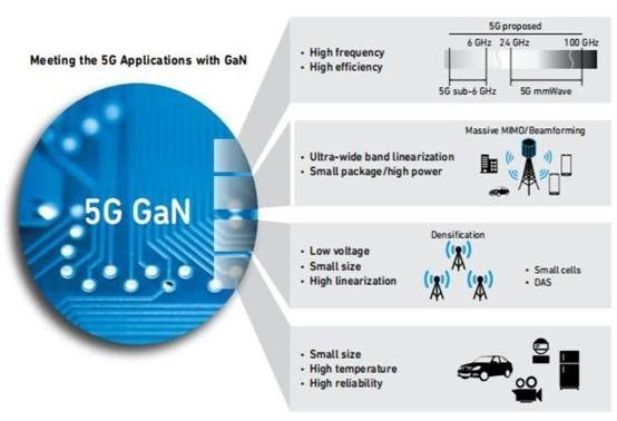 GaN 的射频零组件具有高频、高功率、较宽频宽、低功耗、小尺寸的特点,能有效在5G 世代中节省PCB 的空间,特别是手机内部空间上,且能达到良好的功耗控制。