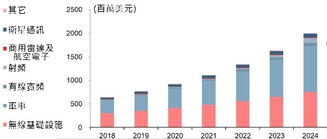 在5G产品中,GaN主要应用在Sub-6GHz基地台和毫米波(24GHz以上)的小基地站。Yole预估GaN射频市场将从2018年的6.45亿美元成长2024年的20亿美元,CAGR达21%,这主要受电信基础设施及国防两大领域所推动,而卫星通信、有线宽频和射频也有一定的贡献。