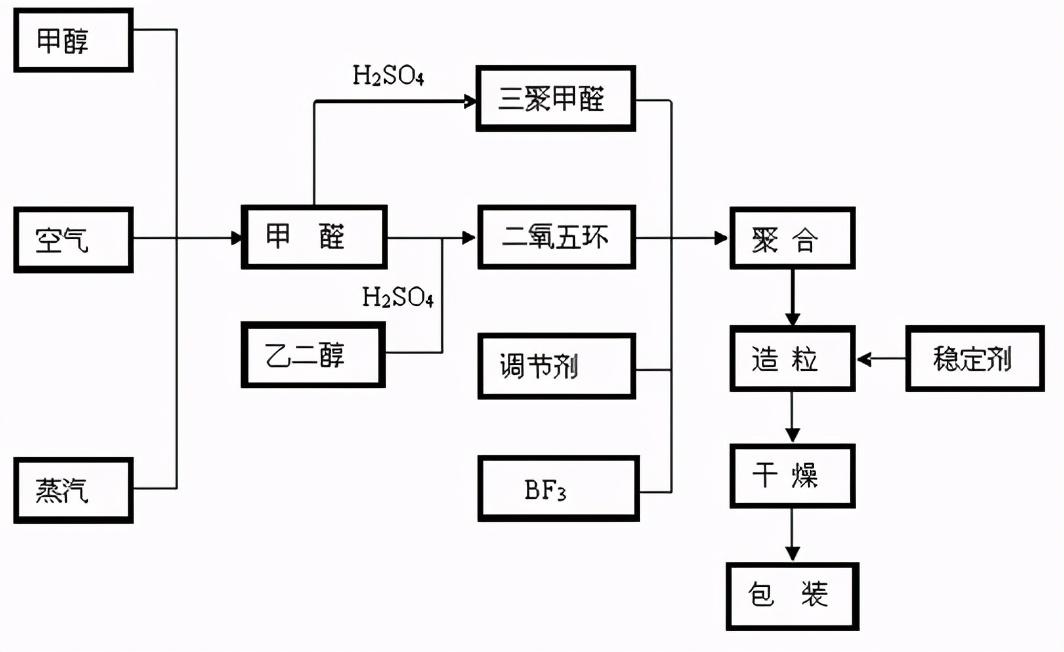 均聚甲醛以三聚甲醛为原料,在石油醚、环己烷、苯等惰性溶剂中进行溶液聚合而成,重复单元为-CH2O-。