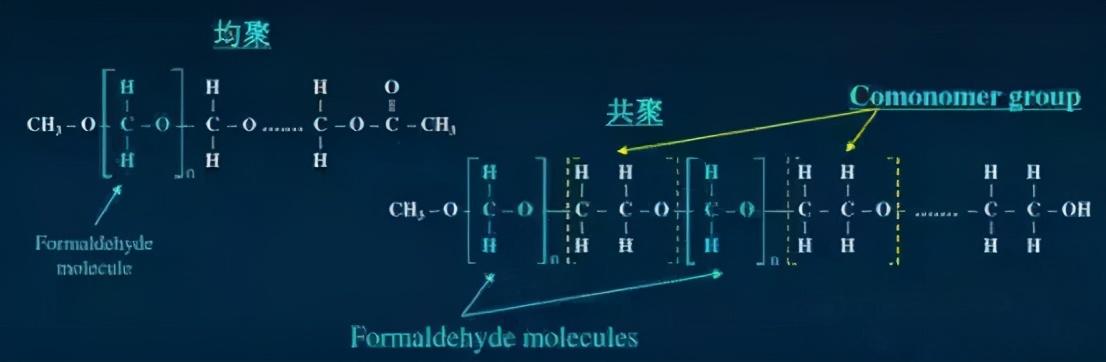 而共聚甲醛在均聚甲醛的基础上还添加了二氧五环作为单体,其重复单元为-CH2O-和-CH2CH2O-。均聚甲醛的力学强度更高,而共聚甲醛的化学稳定性更好。