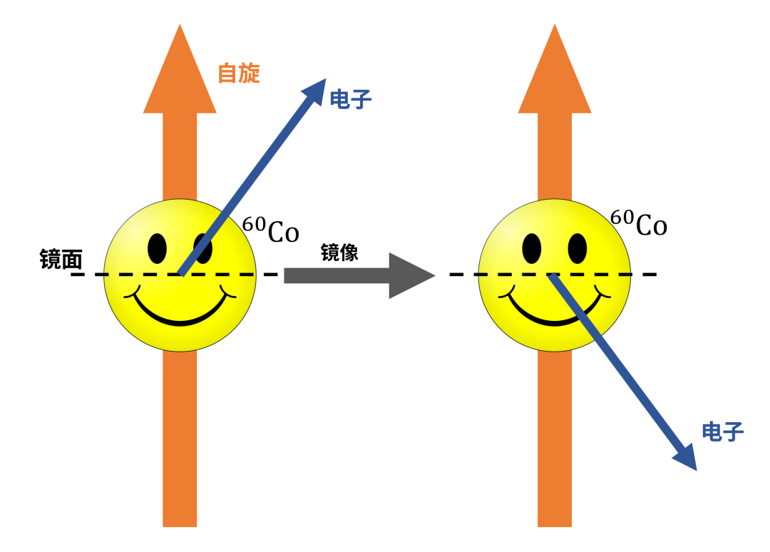 吴健雄的实验考察的是自旋朝同一个方向排列的Co原子(核),Co会发生衰变,放出电子。如果对这个系统进行镜像操作,那么放出的电子的运动方向 会相对于镜面发生翻转 ,而核自旋方向会保持不变 。