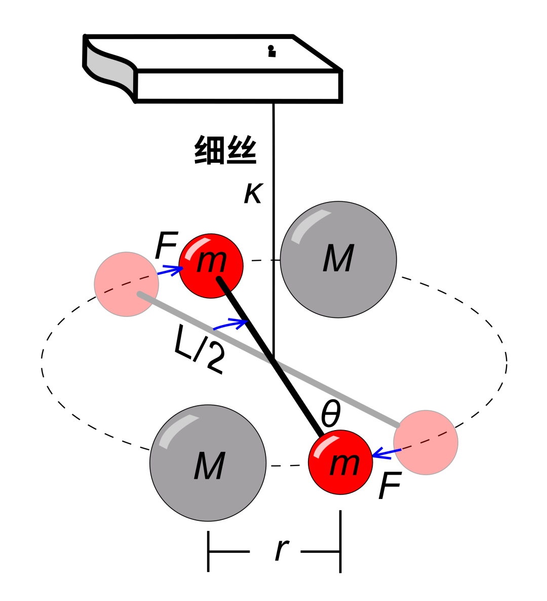 卡文迪许的实验装置是一个扭秤,该扭秤 由一根长杆水平悬挂在一根丝上,两端各挂一个铅球 (甲球)。另外两个铅球(乙球)单独悬挂,放置在扭秤两端铅球附近。甲球和乙球之间相互吸引,使扭秤旋转。平衡时,扭秤的力矩和铅球之间的万有引力平衡 ,根据扭秤的偏转角度卡文迪许可以得到铅球之间的万有引力,进一步可以得到引力常数。