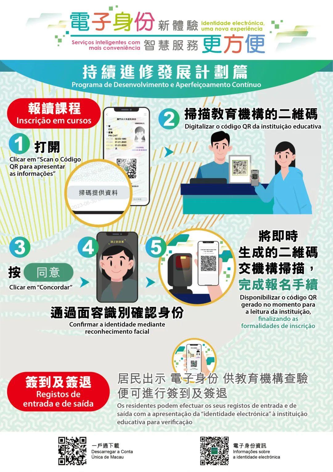 有关持续进修发展计划详情,请参阅相关专题网页(https://www.dsedj.gov.mo/pdac/)。更多“电子身份”资料,请浏览专题网页(https://www.dsi.gov.mo/eid/index.html)。如有查询,请致电身份证明局热线(+853 2837-0777或2837-0888)。