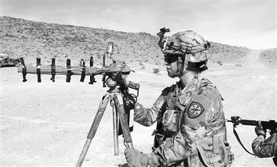 ▼美国推进了一系列电磁防御技术的发展。图为一名陆军网络/电子战士兵在加利福尼亚州欧文堡国家训练中心的演习中设置干扰天线。