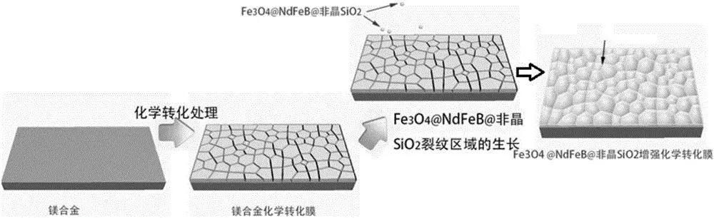 化学转化膜技术是镁合金表面防腐蚀的有效方法。该技术通过镁合金基体与某种转化处理溶液相接触,在金属表面形成一层附着力良好的难溶化合物膜层,这层膜能够保护底材金属不受水和其它腐蚀性环境的影响,改善镁合金零件的防护性能,获得良好的外观,还可以作为涂装等后续处理的底层,提高后续涂装漆膜的附着力,并且该方法操作简单、成本低廉、成膜均匀。