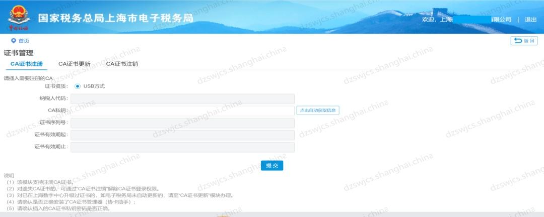 办理企业业务的企业法定代表人、财务负责人以及管理员等通过CA证书功能对CA证书进行管理,如CA证书注册、CA证书更新或CA证书注销。只有法定代表人、财务负责人、管理员具备该功能访问权限。