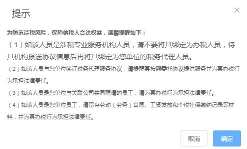 录入需要添加的办税人员的姓名、选择证件类型并输入证件号码、选择身份类型、设置功能集及有效期截止日期。点击【确定】按钮提交,系统进行涉税风险确认提示。如下图所示: