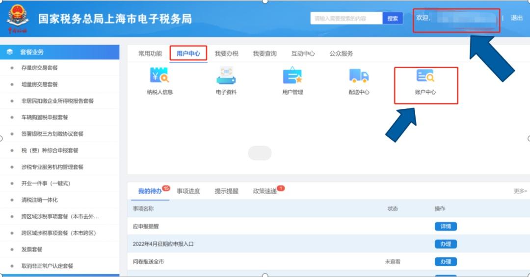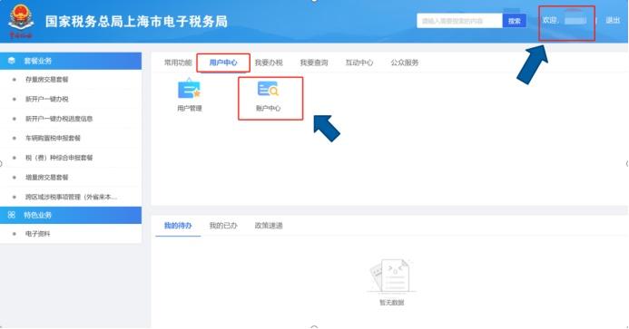 路径:【上海市电子税务局】—【用户中心】—【账户中心】