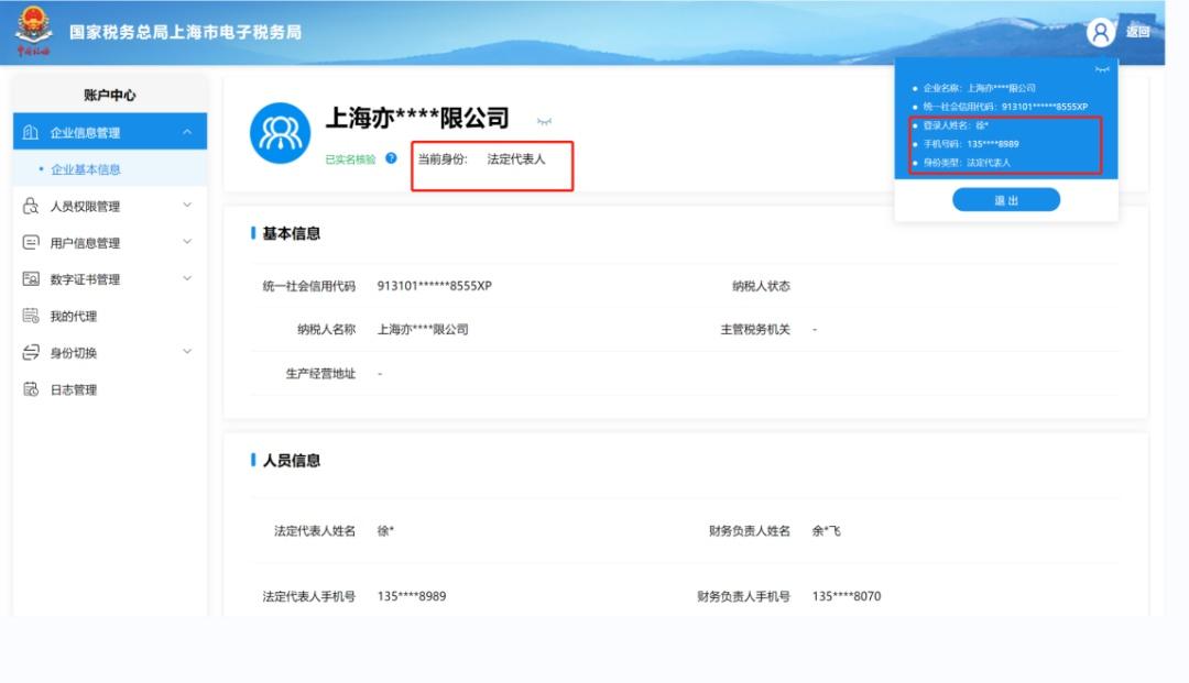 进入账户中心后,默认显示企业的基本信息,包括脱敏的统一社会信用代码、企业名称、法定代表人姓名,以及企业实名状态、主管税务机关、当前人员身份等信息。