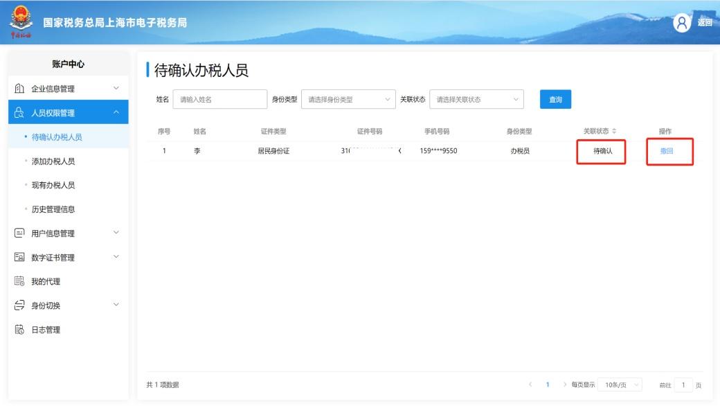 新增加的办税人在自然人尚未确认授权前,在此功能中展示,状态为“待确认”,待确认的办税人信息可以撤回,撤回的办税人员信息可在“历史管理信息”中查看撤回记录。