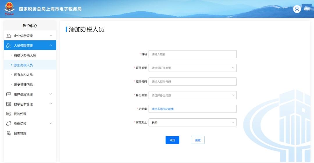 企业法定代表人、财务负责人或管理员在此模块中为本企业添加办税员和开票员。