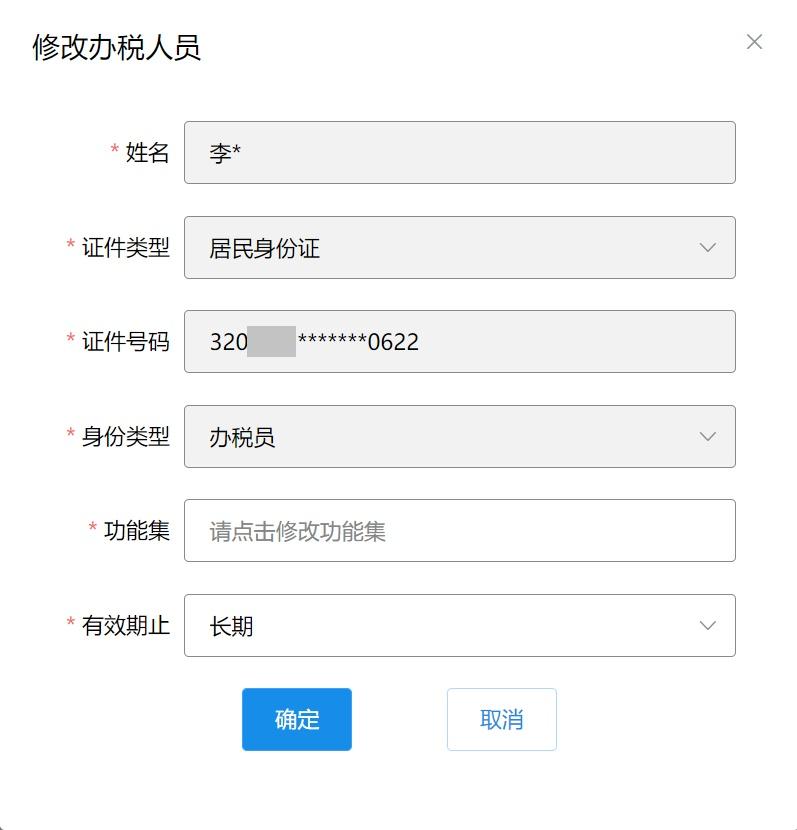 修改办税人员可对该办税人员的授权功能集和授权有效期进行修改。如下图所示;