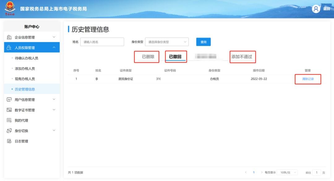 企业通过此功能查看已删除、已退回以及添加不通过的所有办税人员信息。信息过多时,可以清除记录。