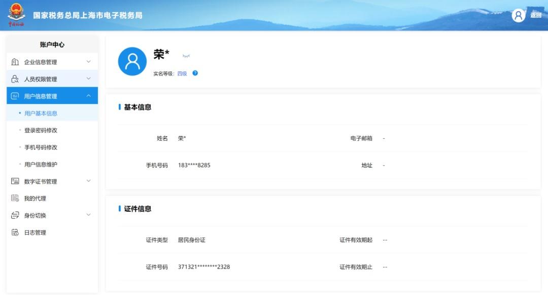 用来查看企业当前登录本系统账号的个人信息和实名等级,包括脱敏的用户基本信息和证件信息,此功能只能查看。