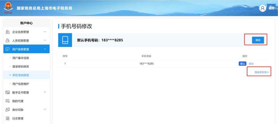 此功能可以对登录电子税务局或统一身份管理平台中的账号的手机号码信息进行维护,如发生手机号码变更,可以通过手机号码修改功能变更手机号码。可以添加、修改、删除手机号码。如下图所示: