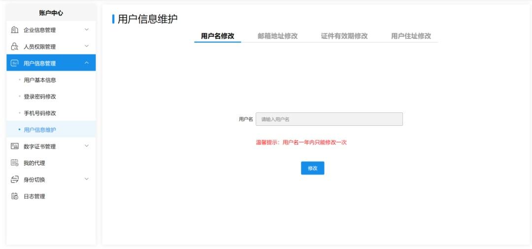 有企业信息管理、人员权限管理、用户信息管理、数字证书管理、我的代理、身份切换、日志管理7个模块。