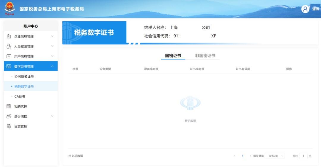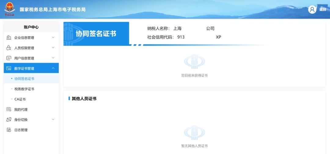协同签名证书模块只有展示功能。企业业务登录的,展示企业与登录人协同签名证书信息。协同签名证书需要在税务APP中申请使用。(目前允许开票员申领协同签名证书)