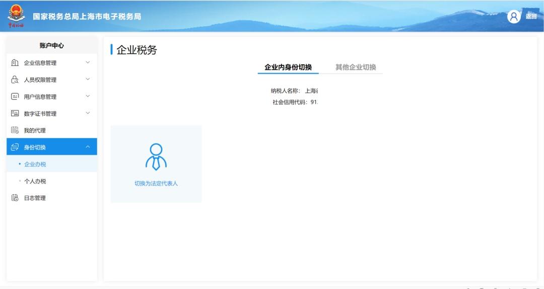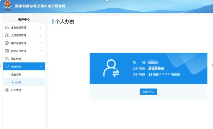 本功能支持企业法定代表人、财务负责人以及办税员等通过“个人办税”功能进行企业业务至个人业务的切换。