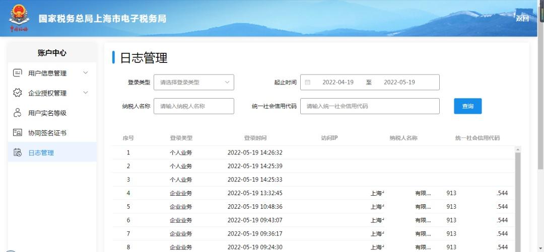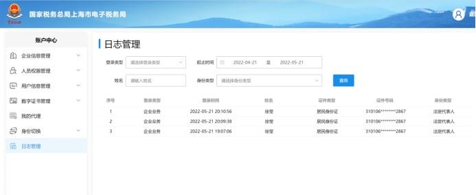 本功能用于查询登录日志,可以按“登录类型”“登录时间”“姓名”“身份类型”等条件进行查询登录本企业账户的记录。仅限法定代表人、财务负责人进行查看。默认展示一个月内的登录数据。