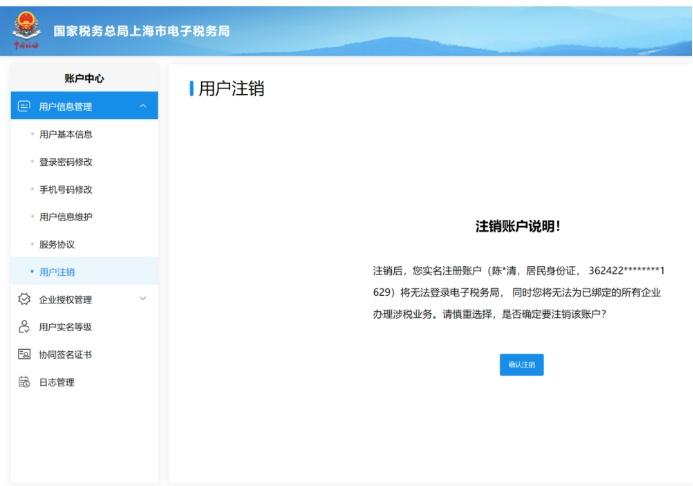 当自然人账号不再使用此账号进行相关业务时,可注销当前登录的自然人账户。注销后,无法对已关联的企业再进行业务操作,注销的账号无法恢复,如需继续使用此账号,需要重新注册,请慎重操作。