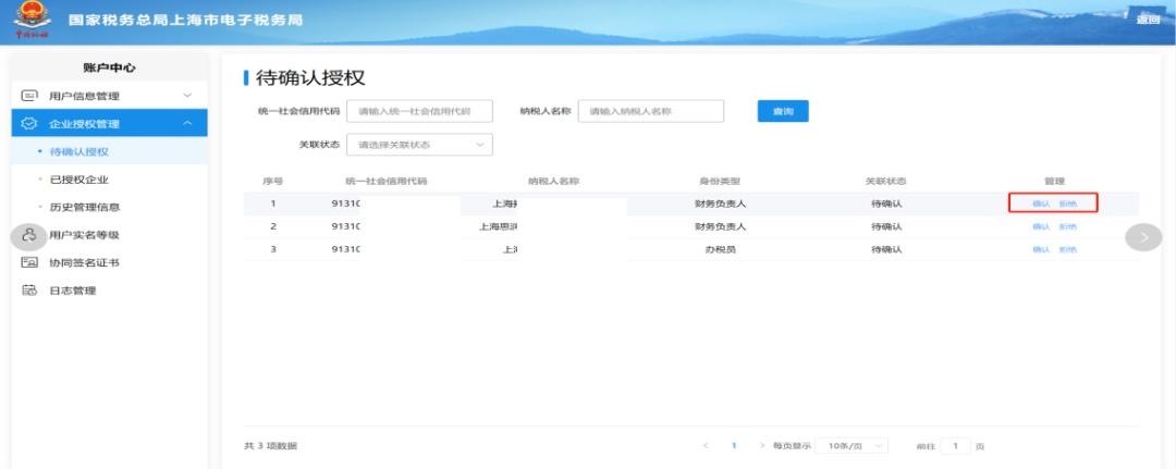 企业添加自然人为办税人员时,需要自然人通过此功能进行确认授权,自然人可以对企业的申请授权接受或拒绝操作。