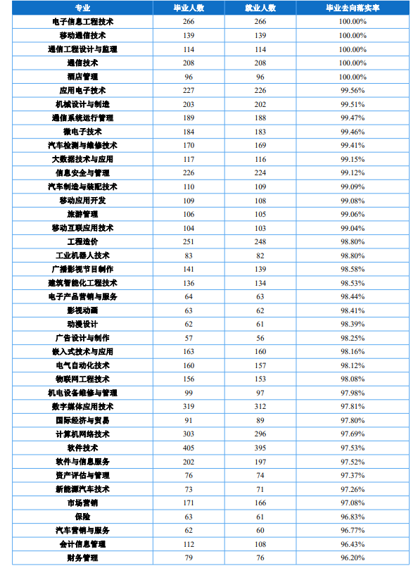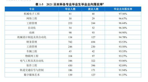 根据《重庆移通学院2021届毕业生就业质量年度报告》数据,毕业生就业行业最多的是“信息传输、软件和信息技术服务业”,占比23.73%,其次制造业占比15.38%。专业对口度80.83%。学生对学校满意度98.11%。用人单位对学生满意度100%。根据近年来数据,该校毕业生在信息产业就业的占比60%以上。