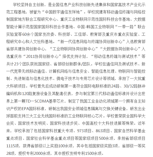 重庆邮电大学 是工信部和重庆市共建高校,在信息通信领域具有重要影响的高水平教学研究型大学,被誉为“中国信息通信人才的摇篮”,目前学校大力推进“世界一流学科攀登计划”实施,力争早日跻身“世界一流学科”建设高校行业。