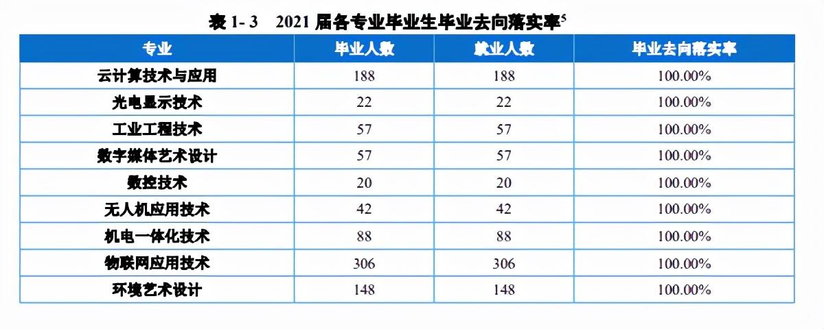 根据《重庆电子工程职业学院2021届毕业生就业质量年度报告》数据,学校58个专业中各专业毕业去向落实率均在86.11%以上,其中云计算技术与应用、光电显示技术、工业工程技术等14个专业的毕业去向落实率均为100.00%。毕业生就业行业最多的是“信息传输、软件和信息技术服务业”,占比21.74%,其次制造业占比21.19%。专业对口度对口度为83.04%。学生对学校的总体满意度99.51%。用人单位对学生满意度为100.00%,