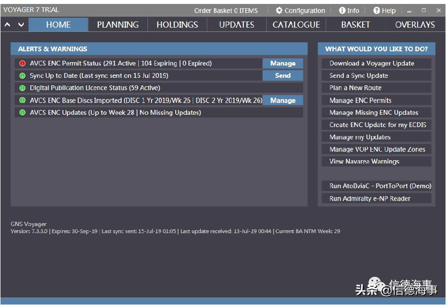VOYAGER7 可以从供应商那里直接获取世界所有海图 OPEN PERMIT(除缅甸印度新加坡外)按自己的需要进行安装到 ECDIS(但ENP 和 ADP 还需以购买方式获得,)。你也可以把全世界的海图装进电子海图.计费是按照监测 AIS 和 IM-C 实际航行经过哪张向公司收取哪张费用,OPEN PERMIT一般三个月的有效期,到期后.供应商会自动更新下季度有效的 OPEN PERMIT