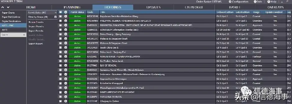进入HOLDINGS 验证设置结果,我轮航线为PRACHUAP-PHUMY,所需海图十几张,UPDATES