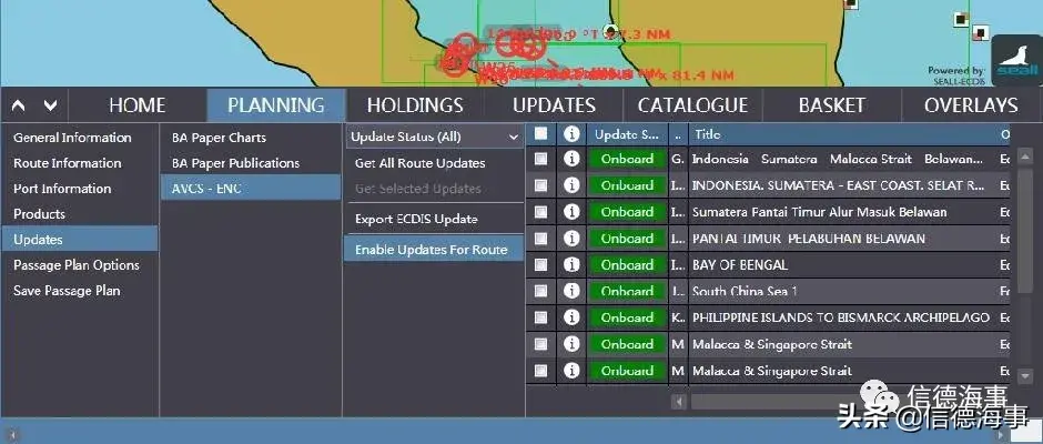 VOP 区域选择更新,VOP意为voyageropenpermit,正常使用时HOLDING之中会显示所有海图,分 9个区,可选择对应区域更新,因AVCS 总图数在 15000+,所以对应每个区域的每周更新也不会少,不建议区域更新。如何设置航线涉及所有海图更新?首先电子海图导出XXX.RTZ 格式的航线数据,导入 VOYAGER7中,再根据下图方式依次点击,最后一步一定记得点 ENABLEUPDATES FOR ROUTE,这样就设置好要更新的海图了.